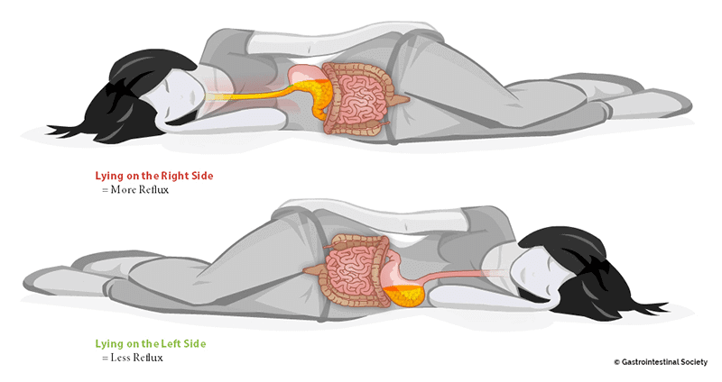 වම් පැත්තට නිදාගත්තම: ආමාශය පහළින් පිහිටන නිසා, ගුරුත්වාකර්ෂණය (Gravity) මගින් බඩේ තියෙන ඇසිඩ් පහළටම රඳවා ගන්නවා. එතකොට ඒ ඇසිඩ් කවදාවත් උගුර දෙසට එන්නේ නැහැ.